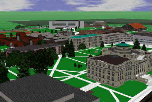 Overview T his is a view of the west half of the Iowa State University campus. Buildings from the colleges of engineering and design are visible, as well as the computation center, library, and administration. The model contains approximately 50,000 triangles and 50 level-of-detail nodes. The campus was modeled on an Onyx RE2 and can be viewed in real-time using IRIS Performer. The environment was initially developed as a training test-bed for VR researchers. It was also used for experimental interface development, architectural reviews, interactive student orientation, and real-time walkthroughs.Additional Media |